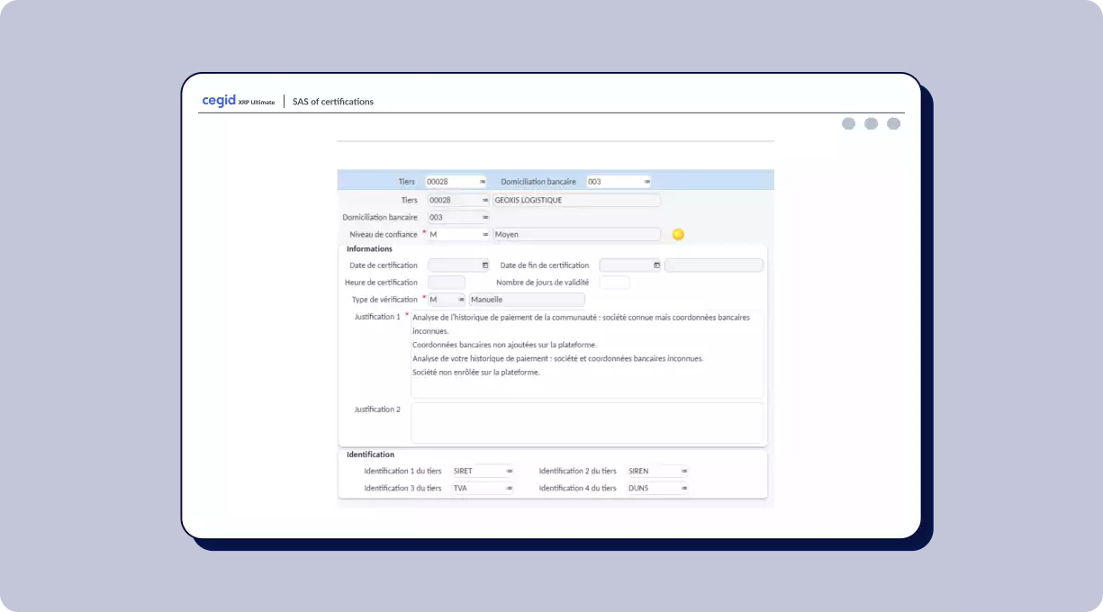 Protect your business from banking cybercrime within your Cegid XRP Ultimate application. The Sis ID solution enables you to verify the validity of your third parties’ bank details—both in France and internationally—directly from your treasury module. Beyond securing your payment decisions, Sis Inside Cegid XRP Ultimate speeds up your verification processes by alerting you in real time if any of your supplier payments carry a fraud risk.