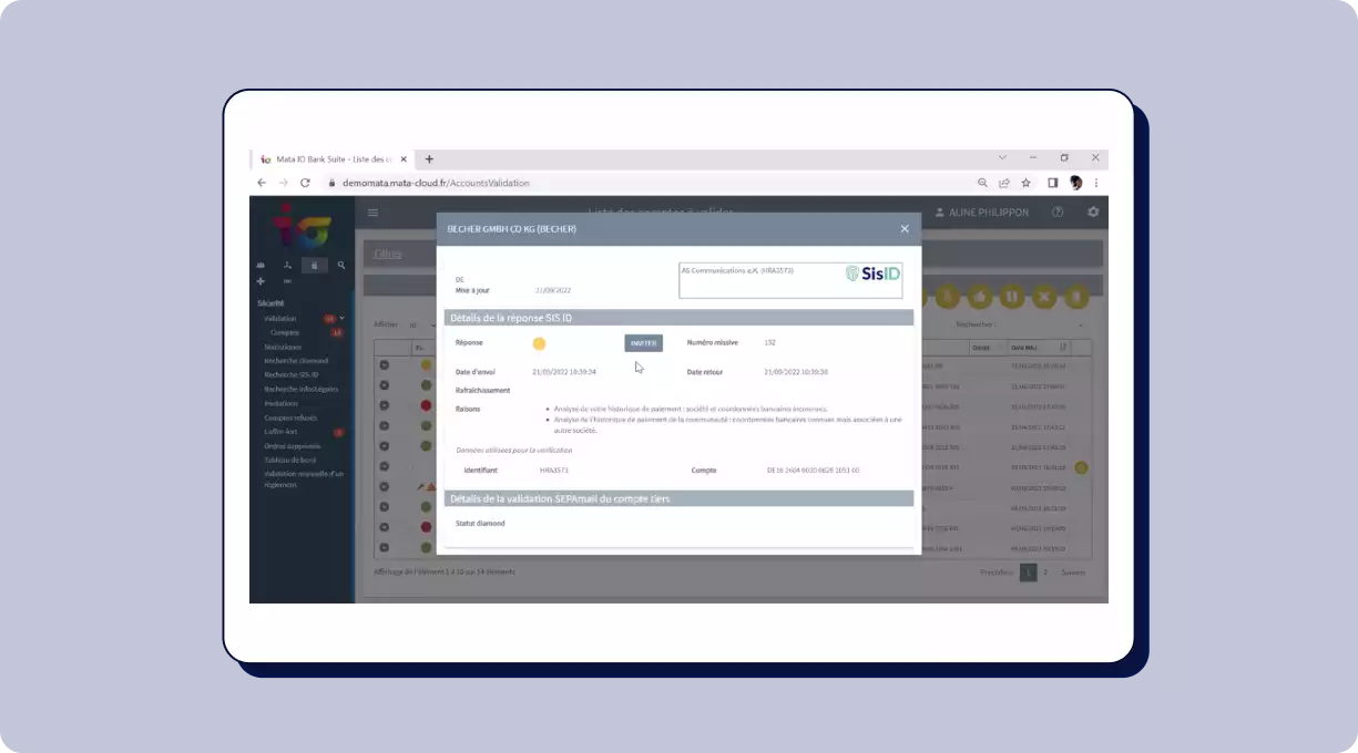 Sis Inside MATA IO automates the verification of third-party bank details directly within MATA IO, securing all payment flows. Beneficiary information is validated at creation, during scheduled or ad hoc audits, and before payment execution, instantly flagging incorrect or potentially fraudulent data. When automatic verification is inconclusive, third parties can have their accounts certified by Sis ID experts. With global coverage, transparent explanations, and timestamped traceability, your teams gain confidence, save time, and ensure accurate and secure payments.